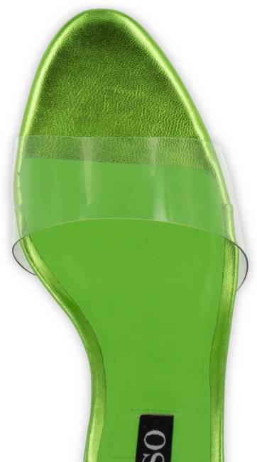 štikle Od Prozirne Kože Od Absint Vinila S Natikačima, Prstima U Obliku Badema I Prozirnim Debelim Remenom Sprijeda.