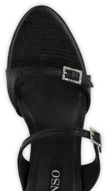 sandale S Petom Od Guštera S Uzorkom Ebanovine S Kopčom Ukrašenom Kristalima I Vrhom U Obliku Badema.