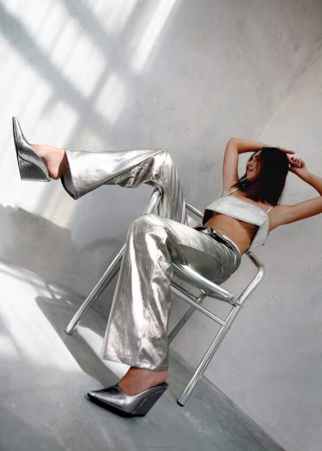 mule S Potpeticama Od čelične Kromirane Kože, Sa šiljatim Vrhom, Dizajnom Za Navlačenje I Klinastom Petom.